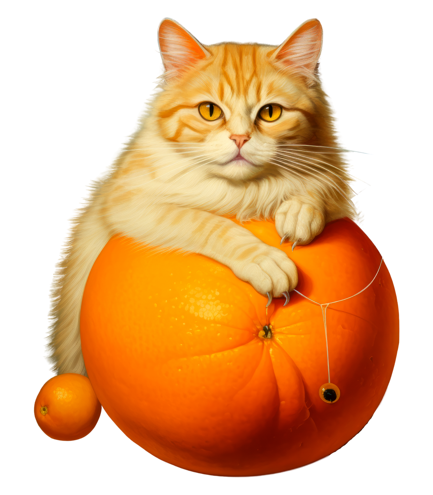 The "Fat Ginger Cat With Orange" design features an adorable rotund ginger cat in all its glory. This feline is portrayed with a mischievous twinkle in its eyes and an undeniable charm that's characteristic of ginger cats. Its fluffy, round appearance is a testament to the cuddly and affectionate nature of these feline companions.