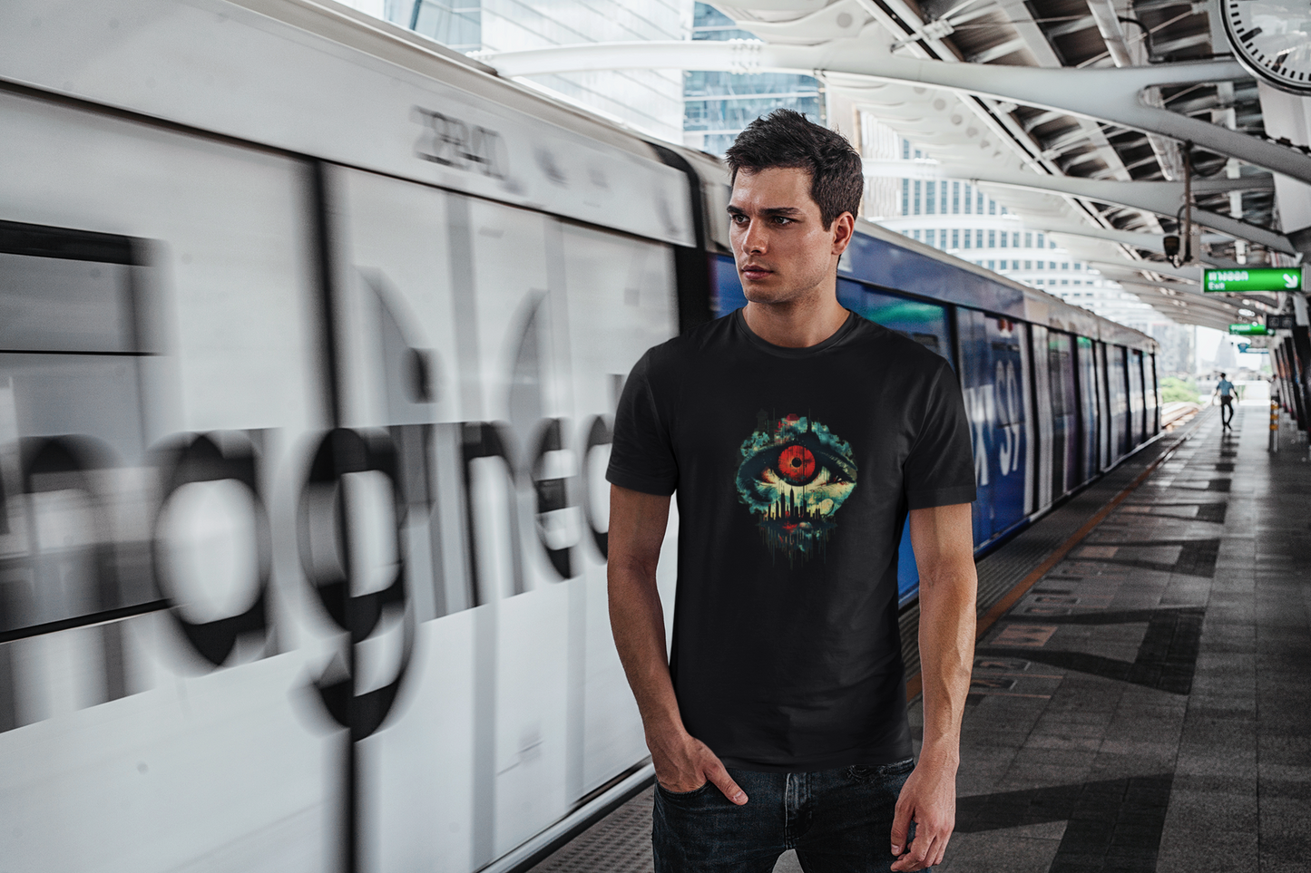 Crafted from soft, high-quality cotton, this T-shirt offers a comfortable and relaxed fit, making it ideal for everyday wear. The impactful illustration showcases the all-seeing dystopian eye, symbolizing the pervasive surveillance and control central to Orwell's chilling vision of a totalitarian future.